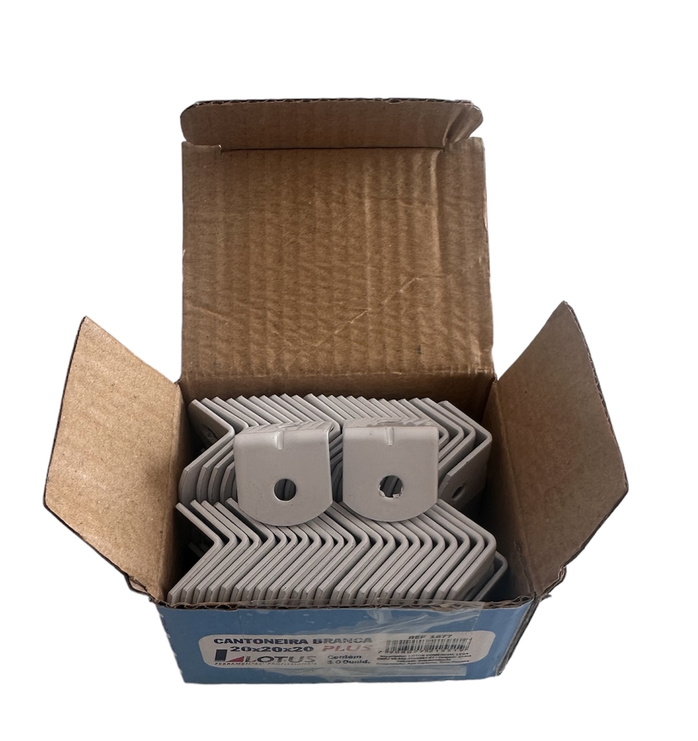 Mini Cantoneira L Para Moveis Cantoneira Flex, super econômica, em L para fixação, em aço forjado e temperado, bi cromatizado, em L 90 graus, orifícios com recesso para embutir a cabeça dos parafusos, para reforço de moveis, molduras, prateleiras, trilhos, prateleiras, etc. Tamanho: 3/4 Polegadas (20x20x20mm) Cor Branca