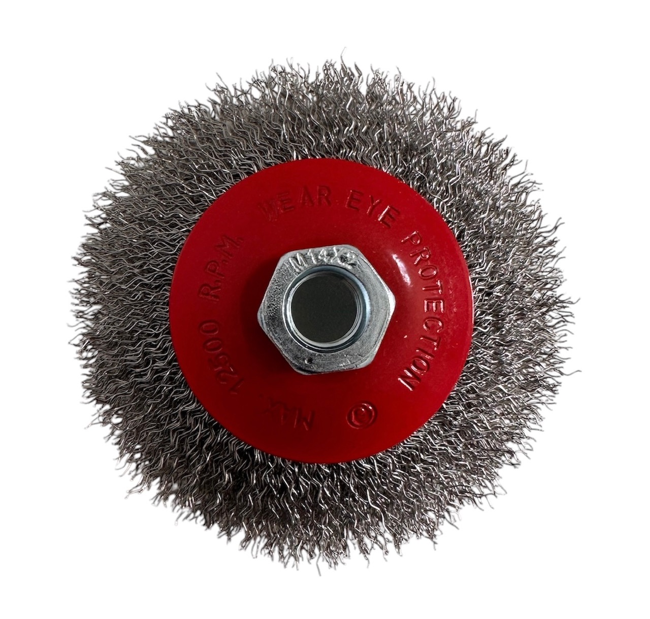 Escova circular cônica de aço carbono, com tufos de filamentos ondulados.